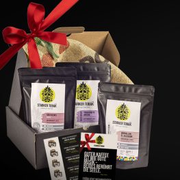 Zwei Kaffee-Geschenkpakete und ein Espresso-Geschenkpaket mit je drei 250 g Packungen und ein Signature-Espesso-Geschenkpaket gibt es zur Auswahl. Handverpackt mit einem Stück original Kaffeesack und einer roten Schleife in einer schicken, schwarzen Kartonverpackung.