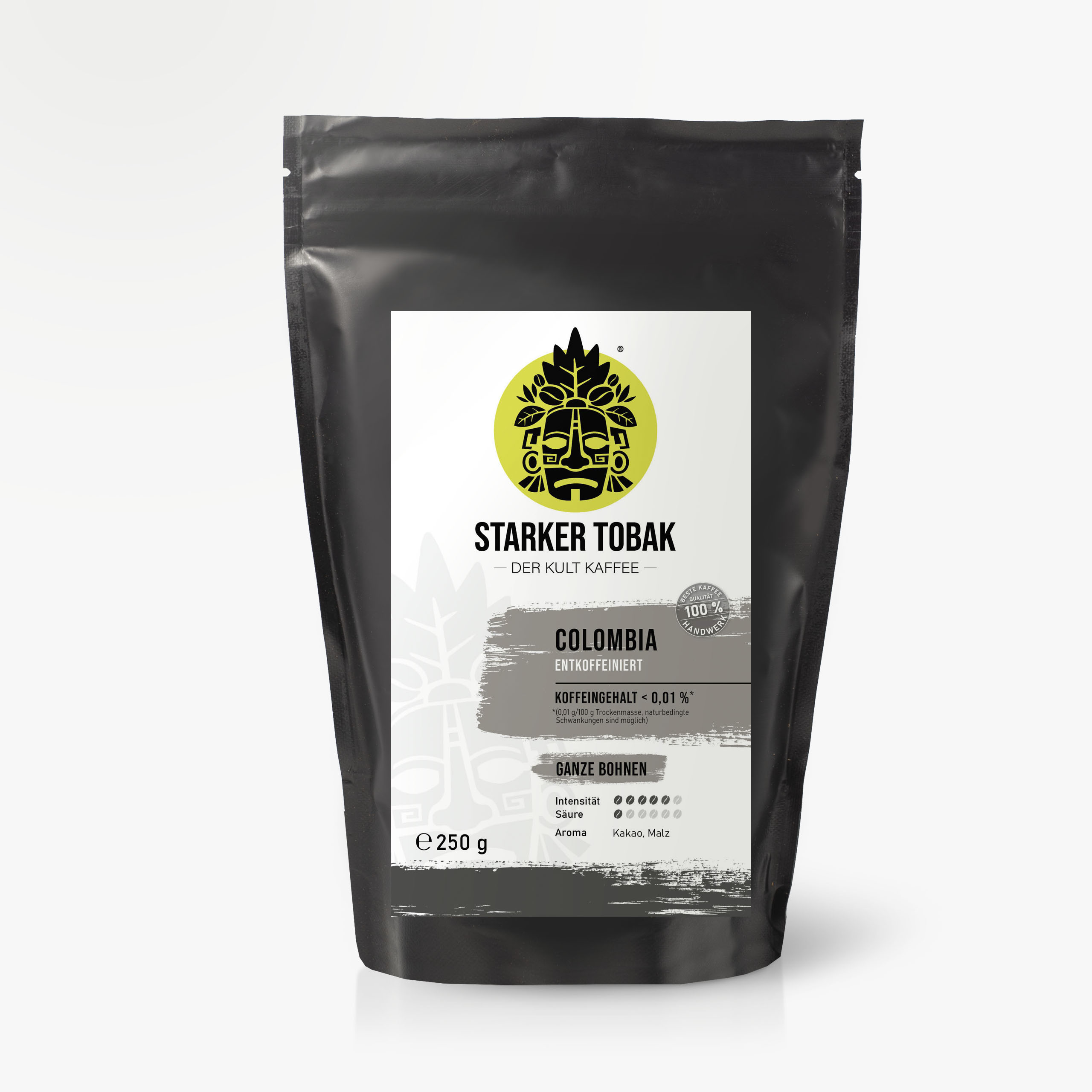 Für alle, die es lieber ohne Koffein mögen: Der entkoffeinierte Colombia bringt den Kick über den Geschmack von feinen süßlich-malzigen und zarten Kakaonoten. Der Kaffee besteht aus verschiedenen Arabica Varietäten, die in Summe den milden Körper ausmachen.